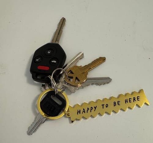 Black text stamped into a gold metal shape makes for a durable keychain that feels good to hold. Measures 3" x .5" and 2mm thick! Comes on a simple split key ring in small polybag with gifting card.